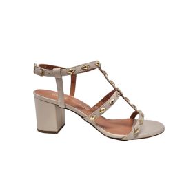 Sandalo in pelle con borchie e v oro. Con tacco da 6 cm