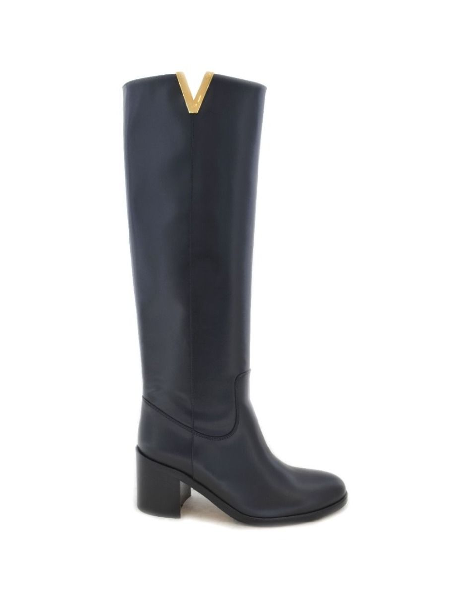 Stivale in pelle nera con tacco esterno e V oro, SENZA zeppa interna
