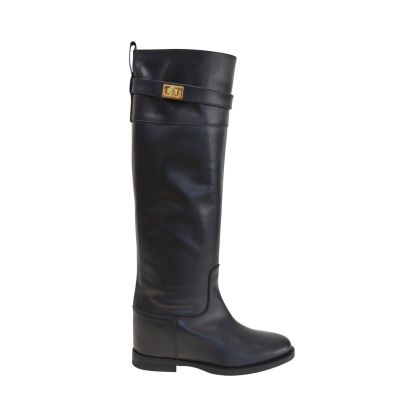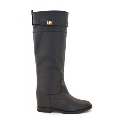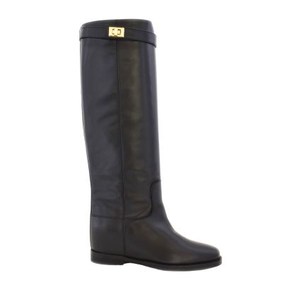 - Stivale in pelle nera con lucchetto oro 3807Stivale in pelle con lucchetto oro apribile e zeppa interna di 3,5 cmA partire da 380,00 €