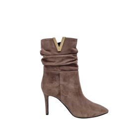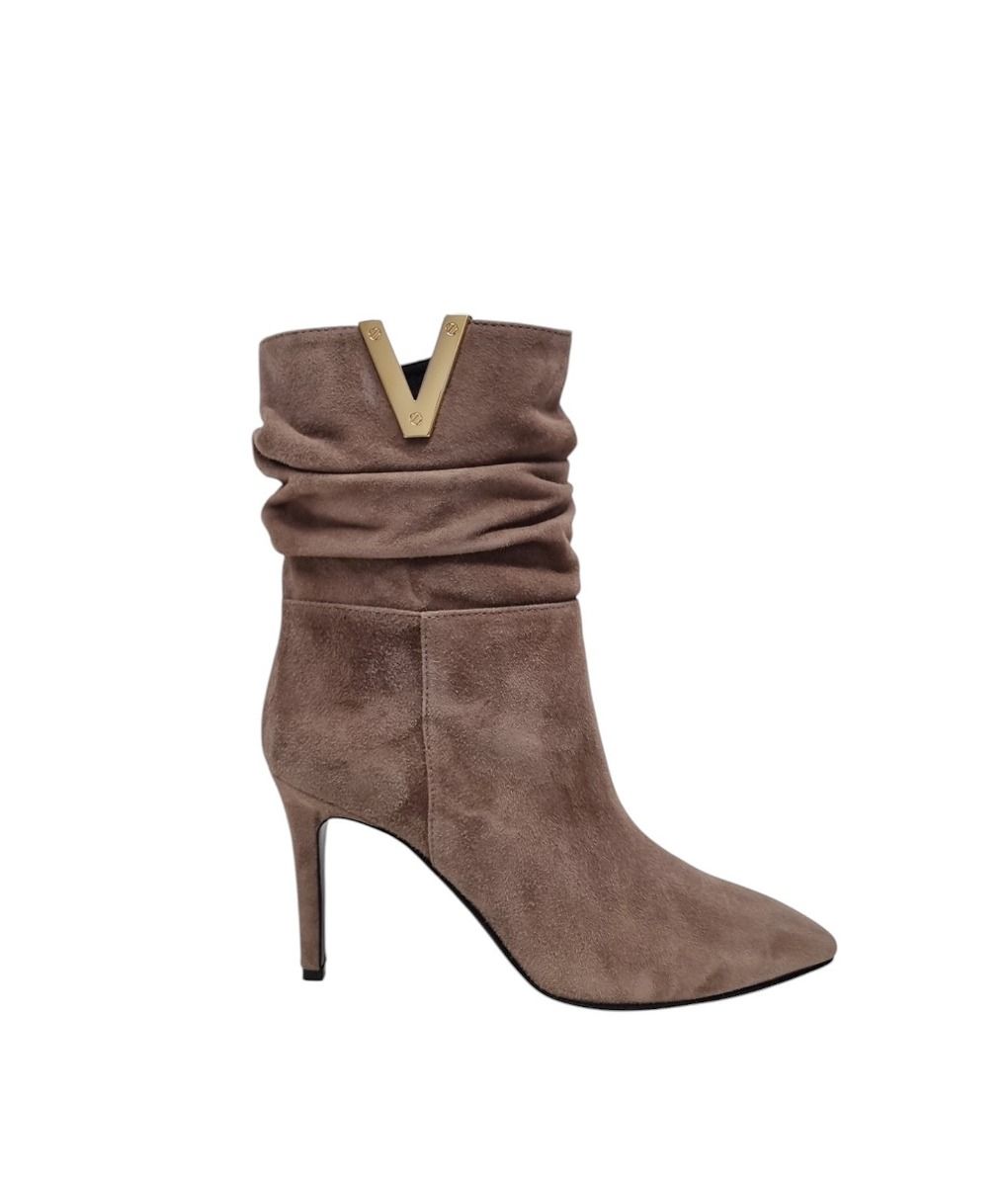 Tronchetto in camoscio con V oro, tacco esterno di 8 cm, mezza puntina antiscivolo. Senza zeppa interna.
